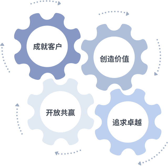 成就客户是一切决策的出发点,,,创造价值是衡量所有工作的标准,,,追求卓越是我们做事做人的态度,,,开放共赢是我们的格局也是最终的结果。。。价值观的齿轮环环相扣,,,,推动着组织里的每个人不断向前。。。
